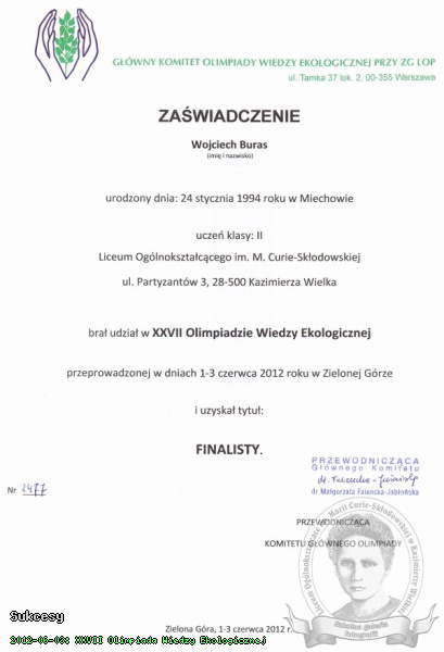 Wielki sukces odniósł Wojciech Buras z klasy 2b. W XXVII Olimpiadzie Wiedzy Ekologicznej uzyskał tytuł FINALISTY (etapu centralnego). Zobacz dyplom.